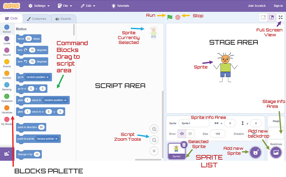 This is how Scratch 3.0 editor looks like when we open it. Let's take a quick look at the interface.